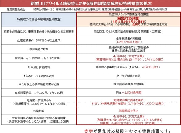 新型コロナウィルスの感染拡大に伴い、4月1日~6月30日の緊急対応期間中は、受給要件が緩和され、また助成内容や対象が大幅に拡充されています。