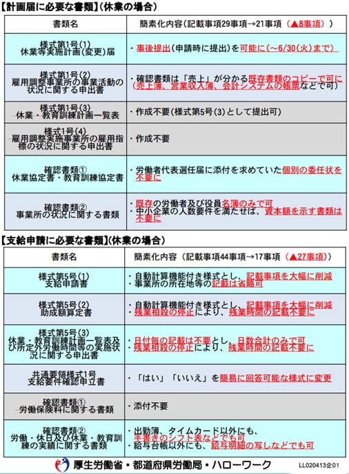 雇用調整助成金の特例措置に関する申請書類等については、大幅に簡素化され、申請手続きの負担が軽減されています。