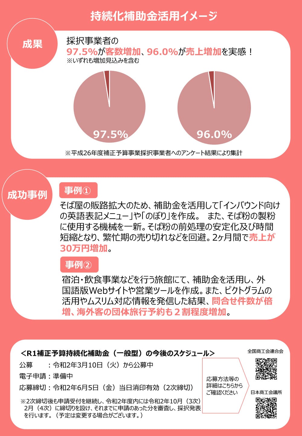 今回はインバウンド需要の縮小(主にコロナ発生地の中国からの旅行客が激減)に対応するため、国内需要を拡大するためのインターネット販売の強化や、ビジネスモデルの転換、旅館等は事業を継続する為に人員の削減等を図る場合にも優先的な採択を受ける事ができます。騒動の終息後の販促活動なども本来の用途となります。