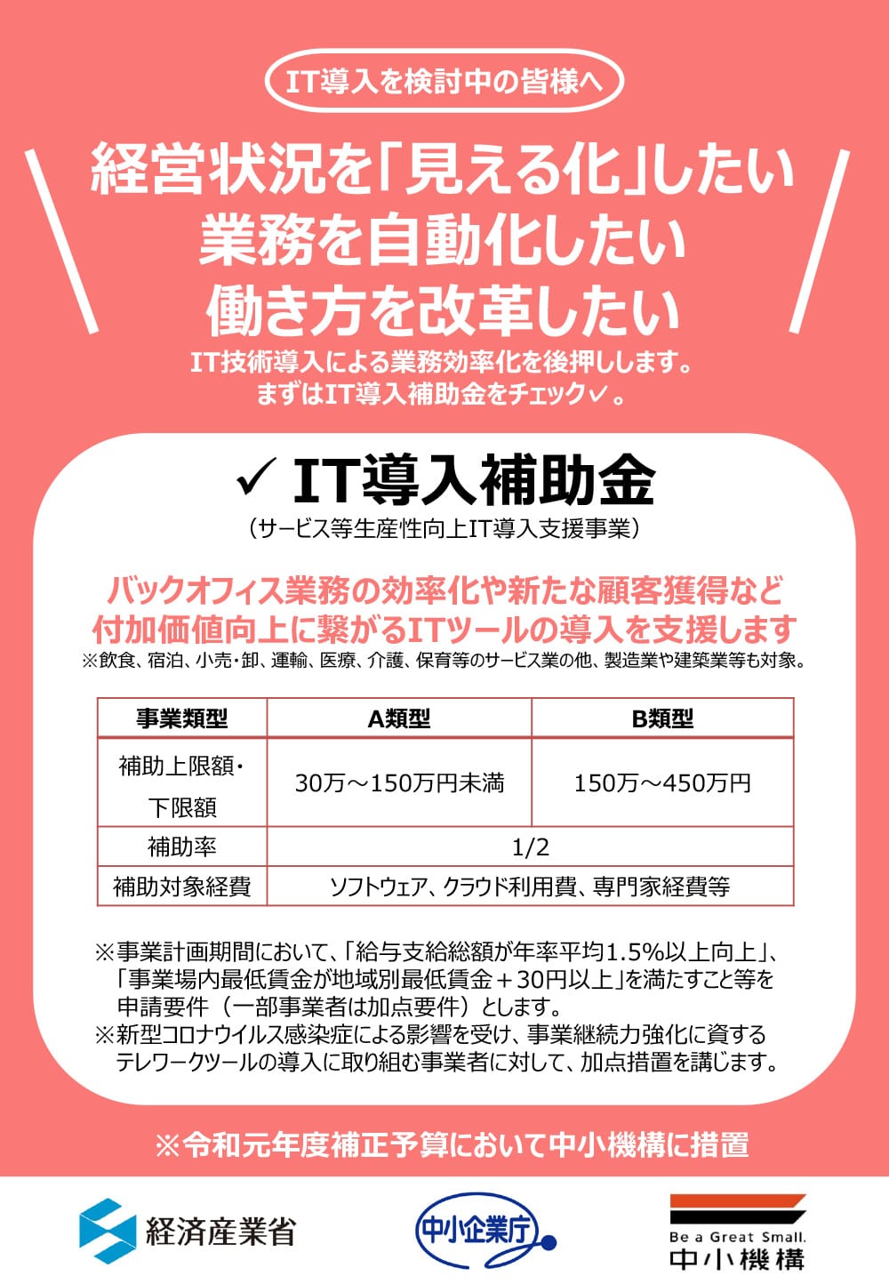今回紹介している3つの補助金制度の中では最も人気が高く、近年は採択が受けづらい状況もつづいていますので、導入したいITツールに複数の候補がある場合は、「WEB会議システム」や「社内SNS」などテレワークに関連した対象製品から導入検討をしてみるとよいでしょう。